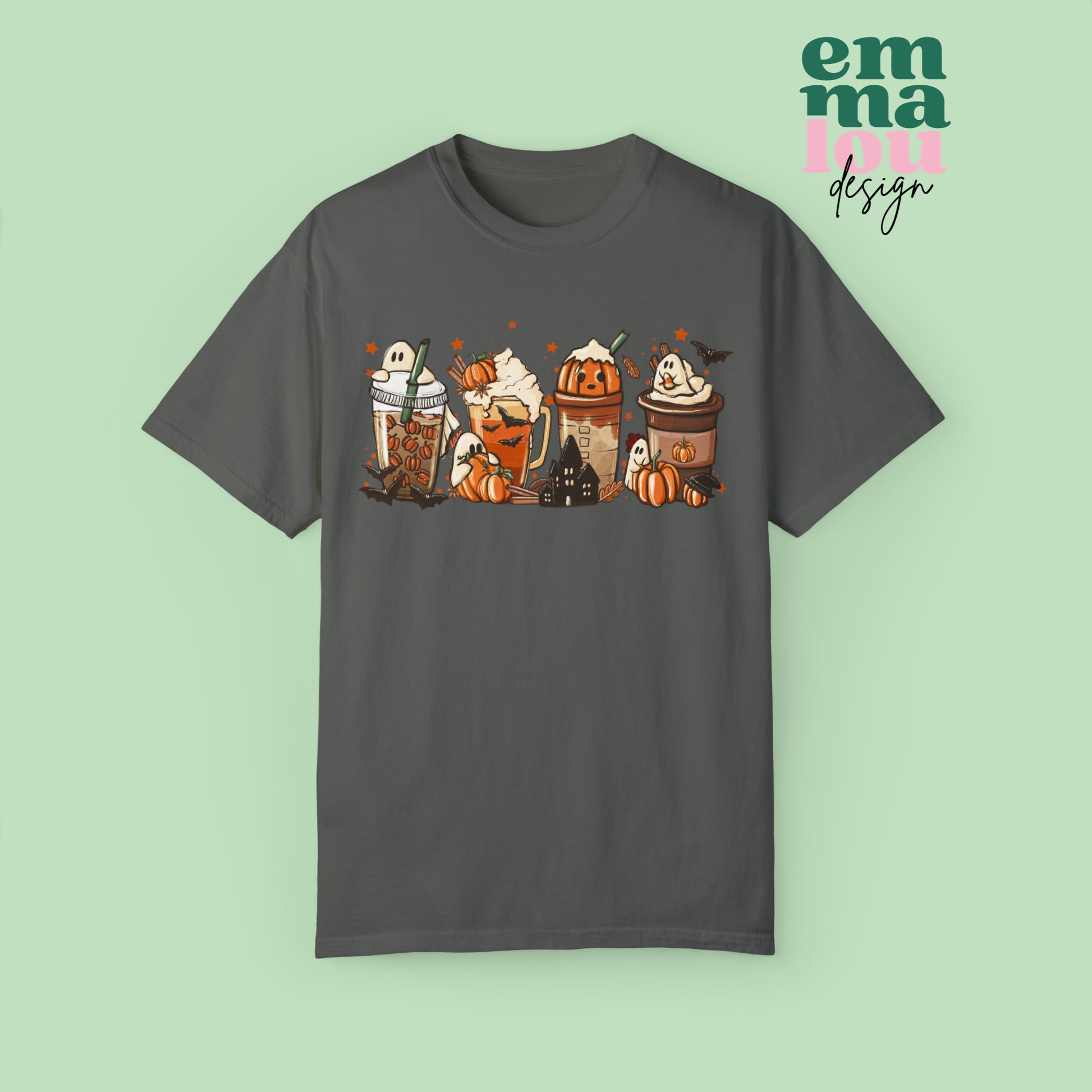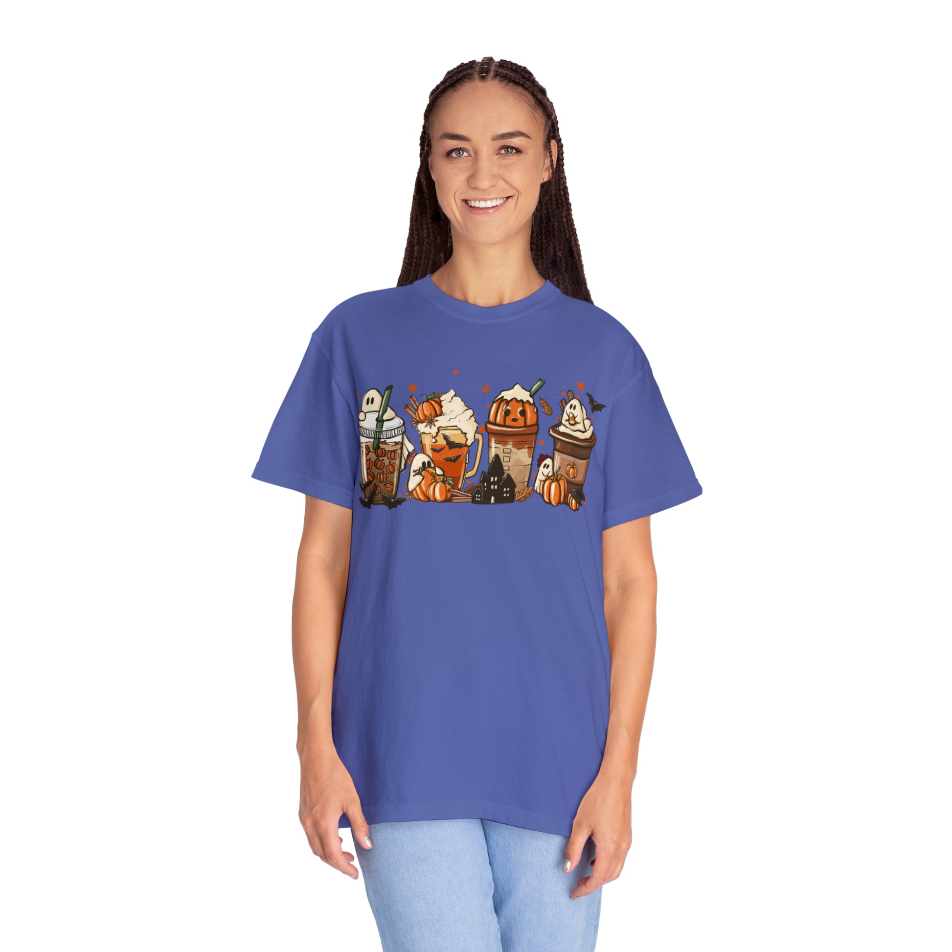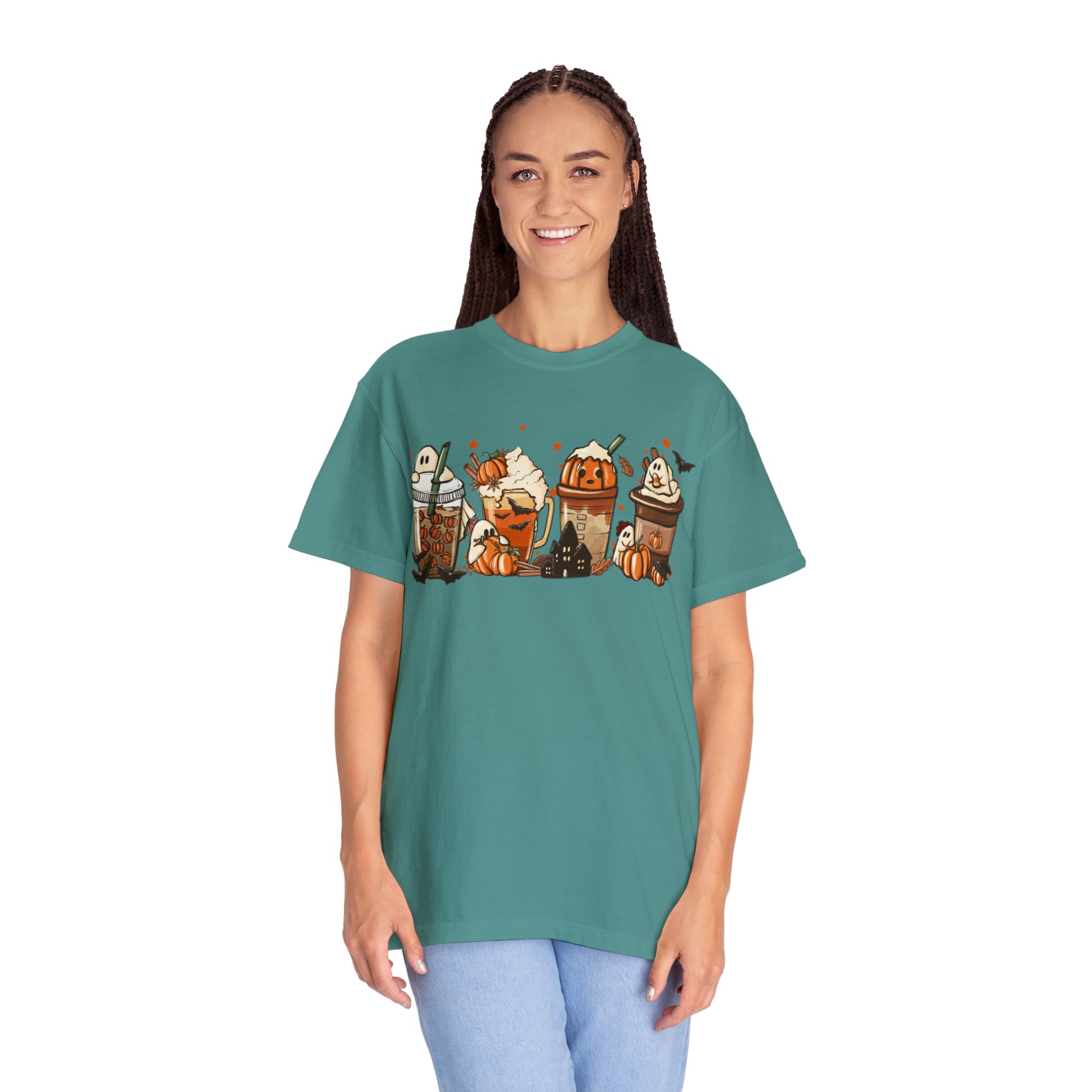 Boo Fall Coffee Latte featuring Ghosts, Bats, and Pumpkins Halloween Comfort Colors Unisex Garment-Dyed T-shirt