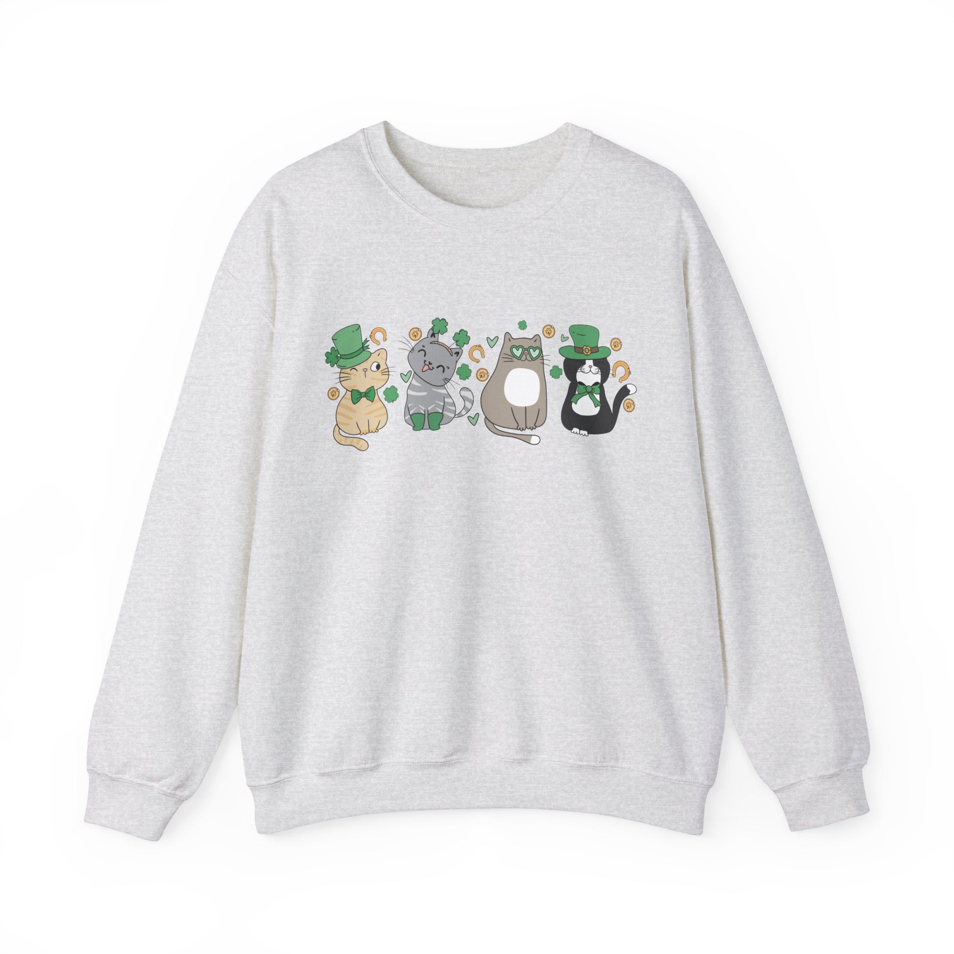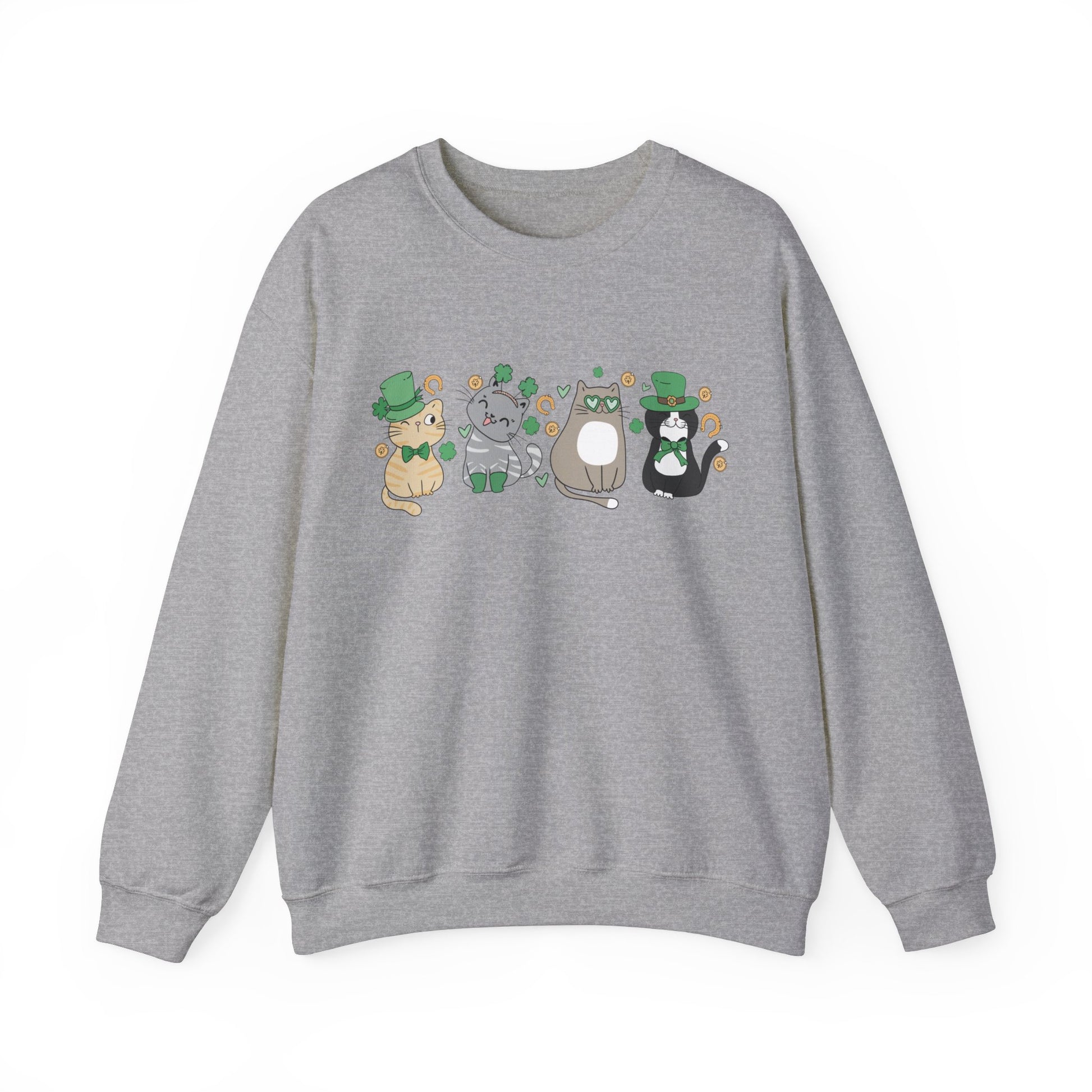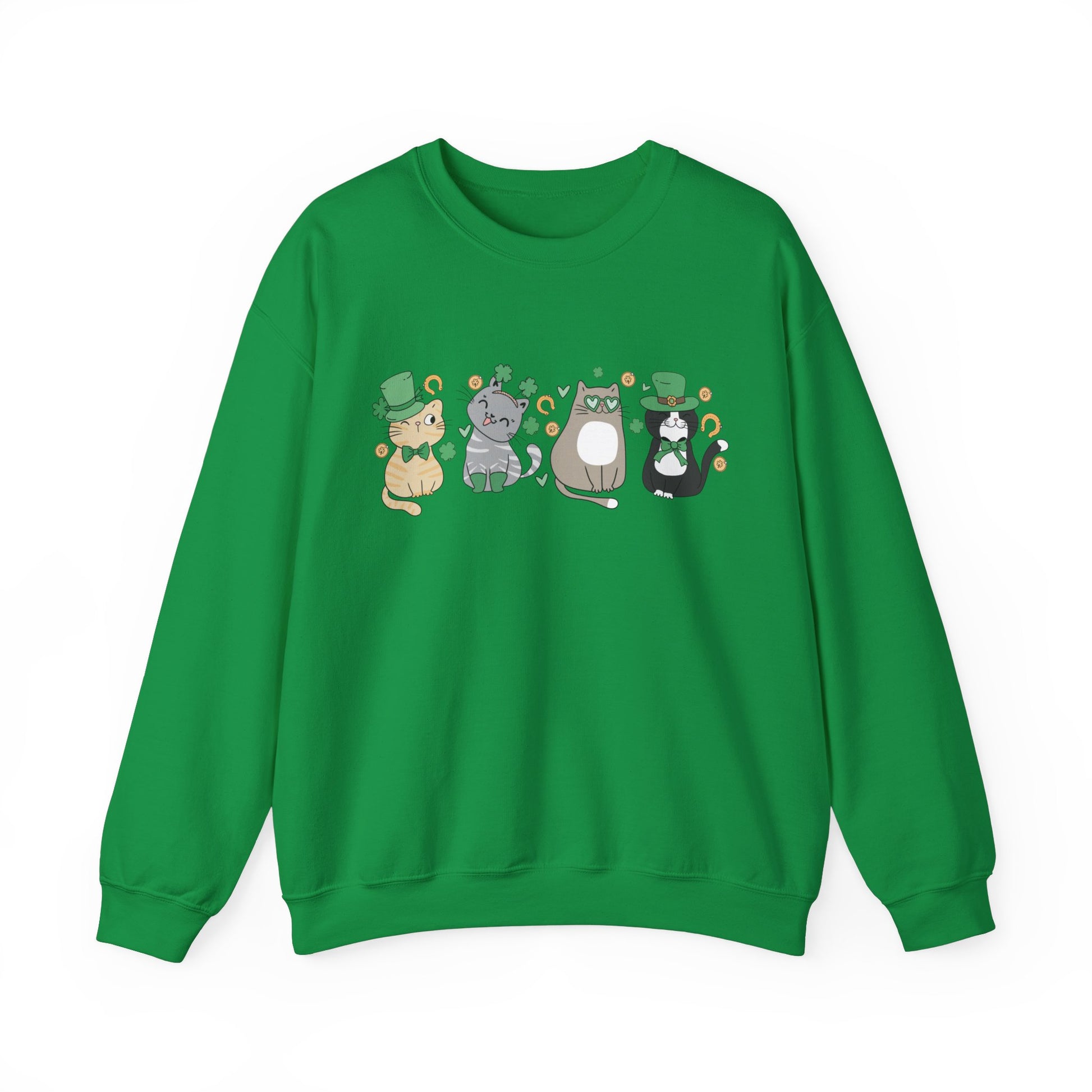 This delightful sweatshirt combines the charm of cats with the festive spirit of St. Patrick's Day, making it a must-have for all cat lovers. Featuring a playful design, this sweatshirt showcases four adorable cats proudly donning their Irish attire. Each cat is adorned with a green top hat and a lucky shamrock, symbolizing the joy and luck associated with this special holiday. The vibrant colors and intricate details bring these feline friends to life, creating a whimsical and eye-catching look.