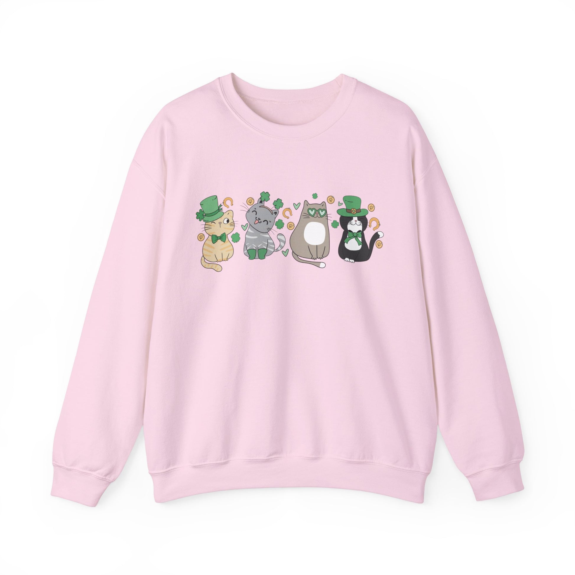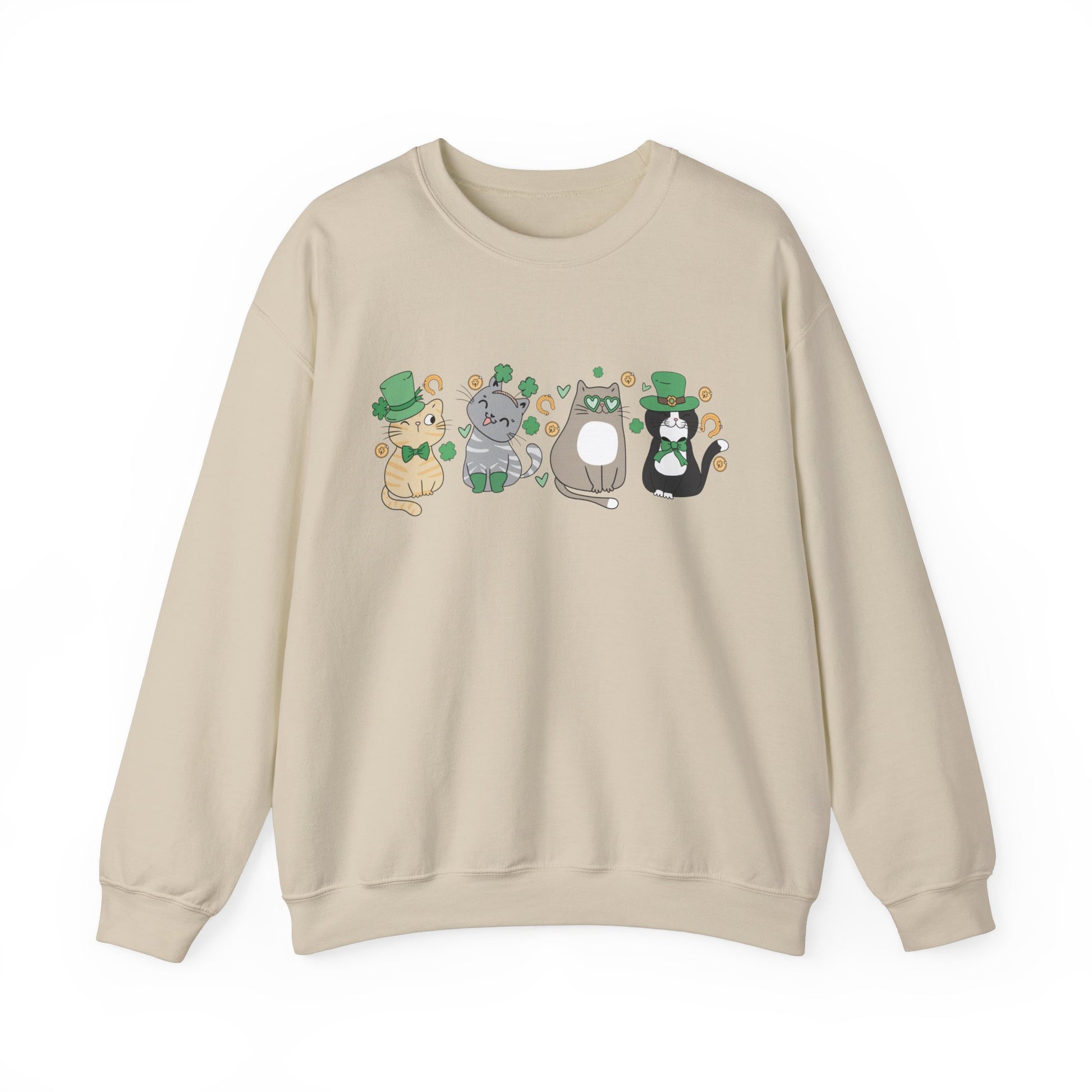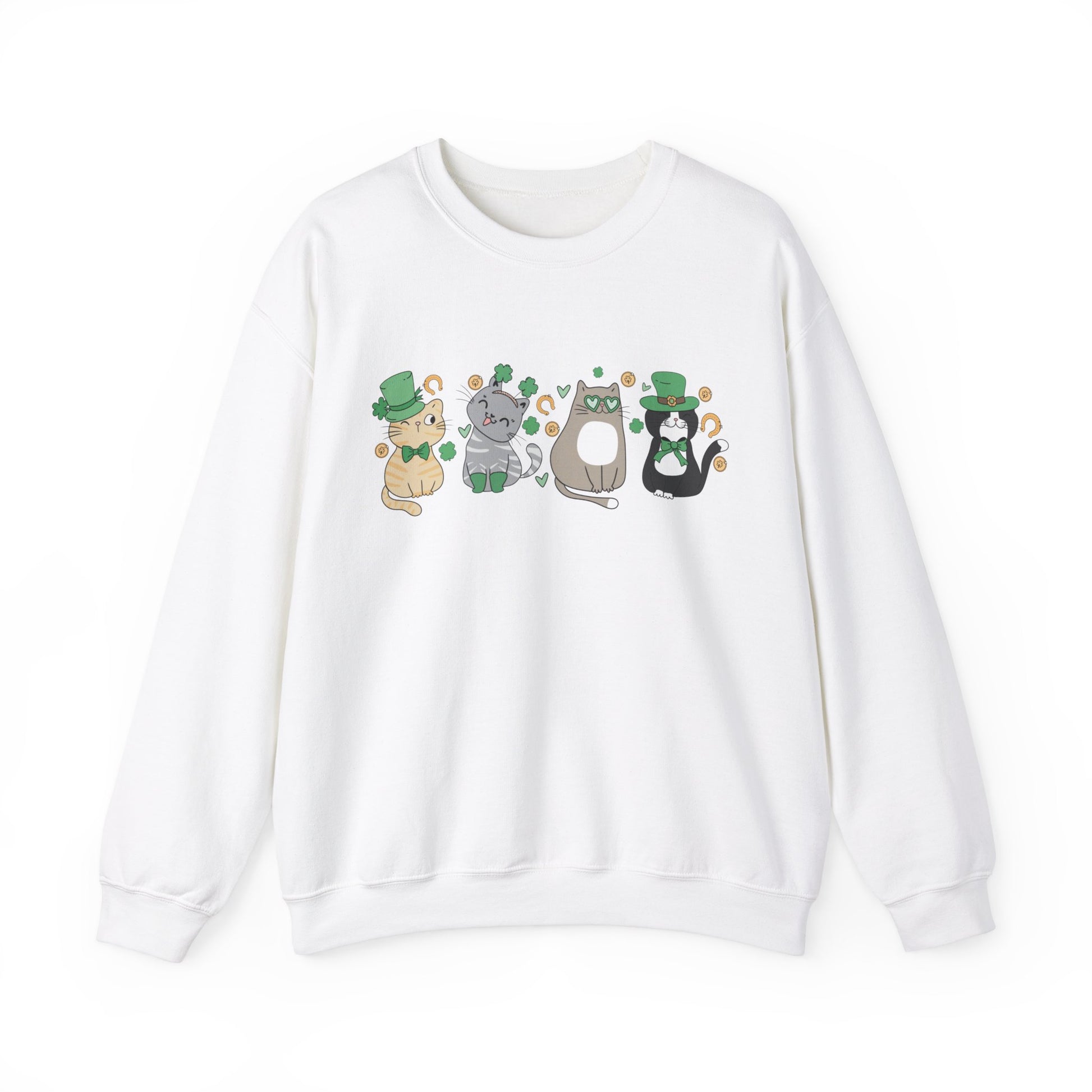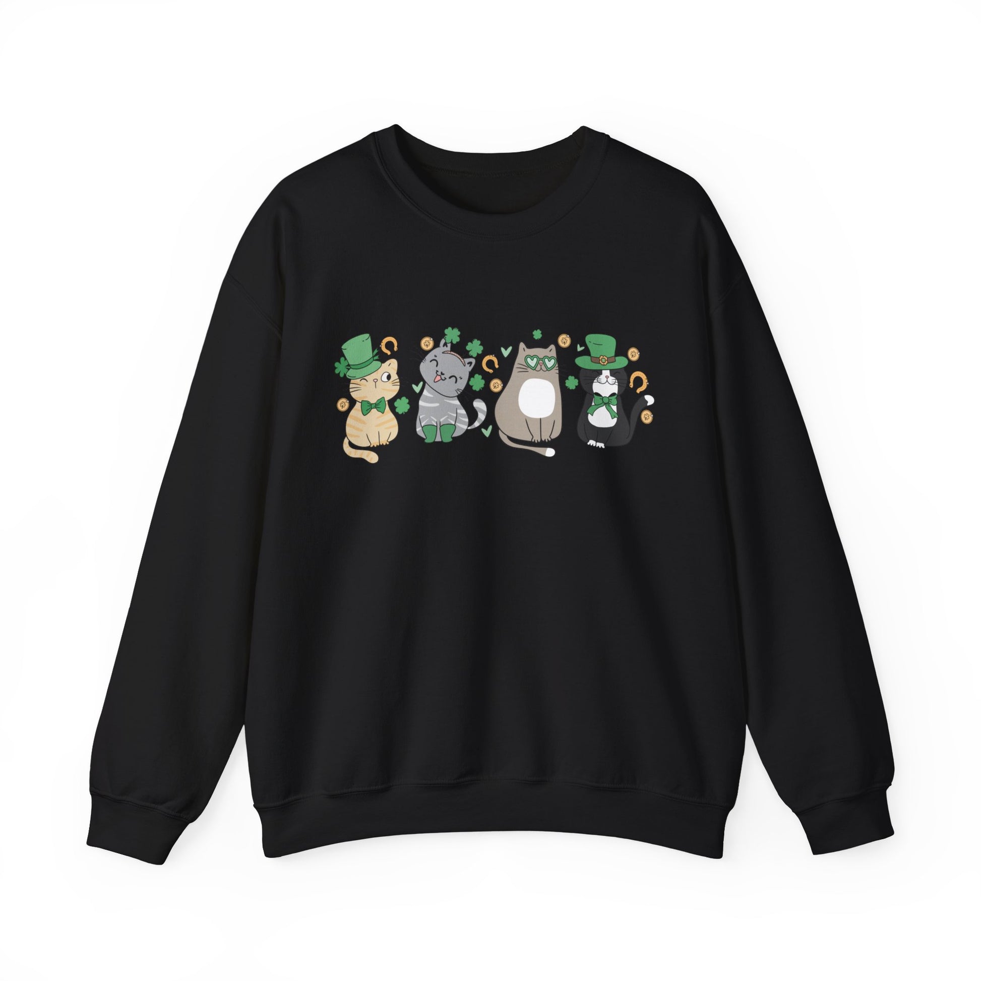 This delightful sweatshirt combines the charm of cats with the festive spirit of St. Patrick's Day, making it a must-have for all cat lovers. Featuring a playful design, this sweatshirt showcases four adorable cats proudly donning their Irish attire. Each cat is adorned with a green top hat and a lucky shamrock, symbolizing the joy and luck associated with this special holiday. The vibrant colors and intricate details bring these feline friends to life, creating a whimsical and eye-catching look.